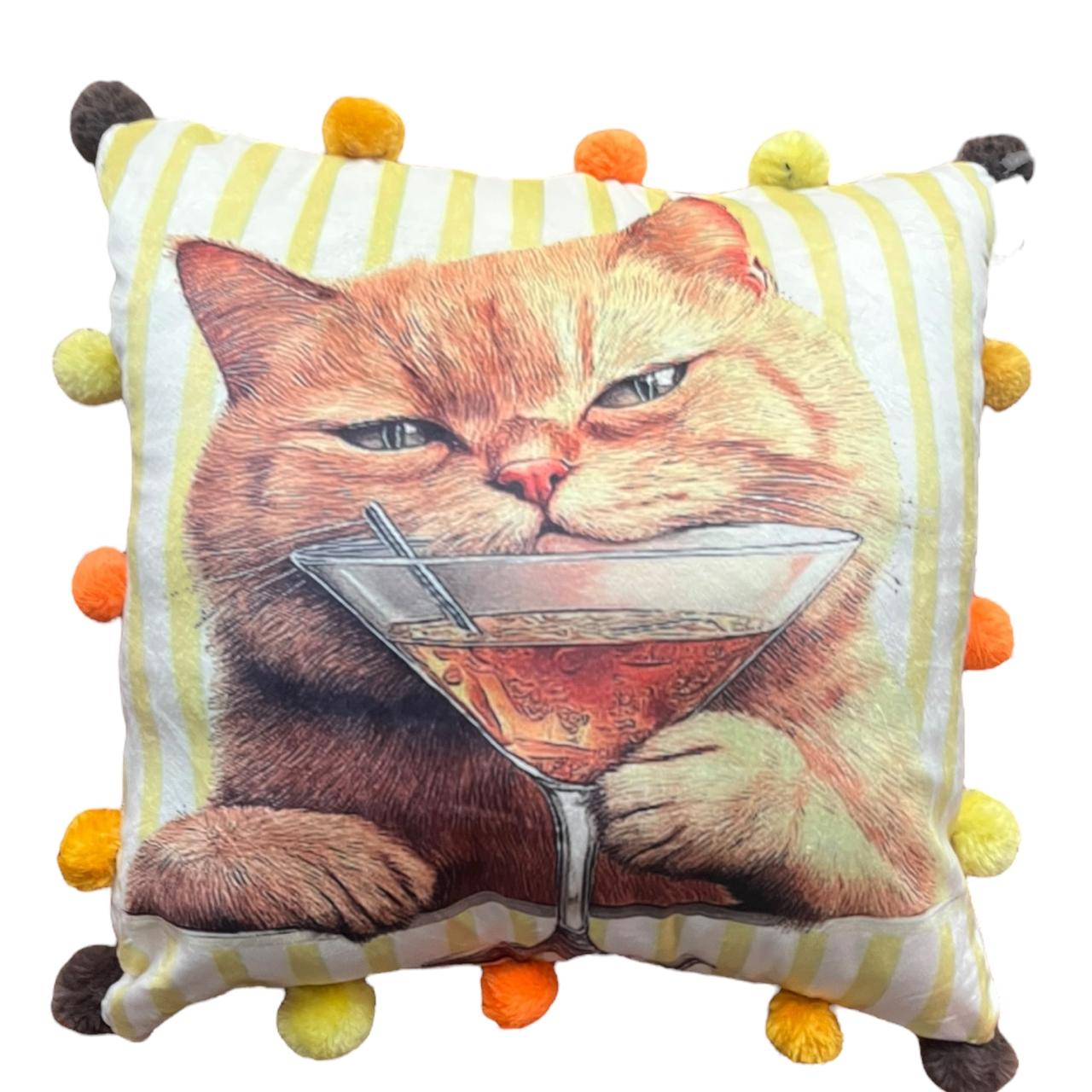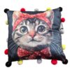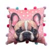 Cojín de terciopelo, color crema con estampado, relleno con napa anti alérgica, 47×47 cm aproximadamente, pompones de colores, 100% polyester