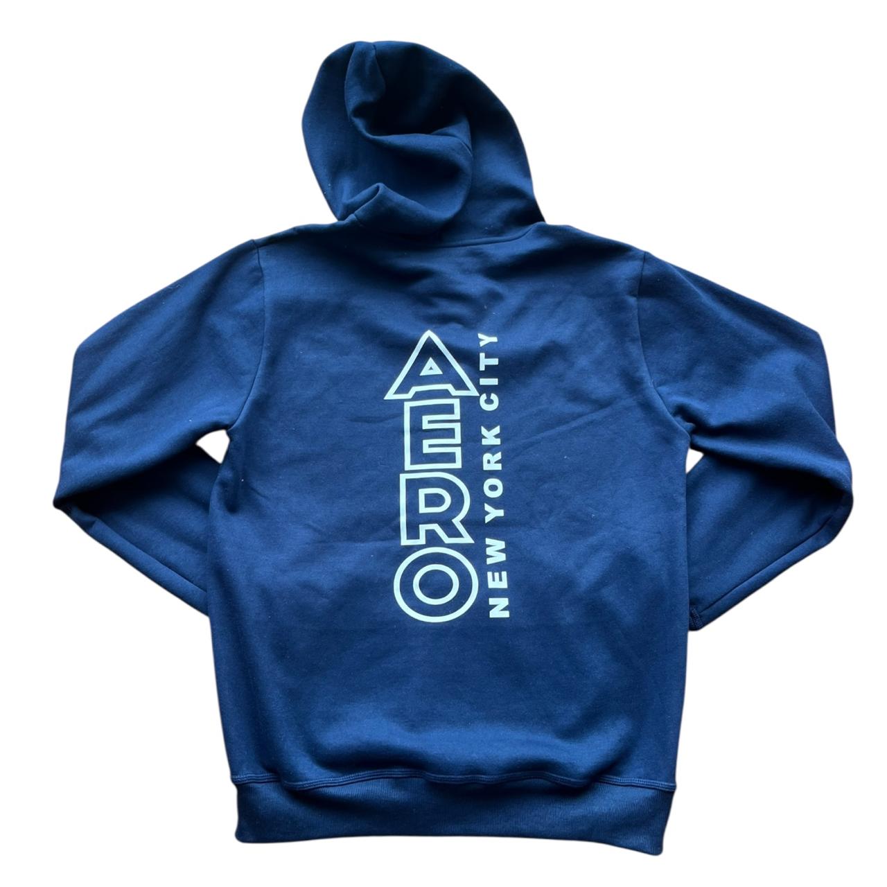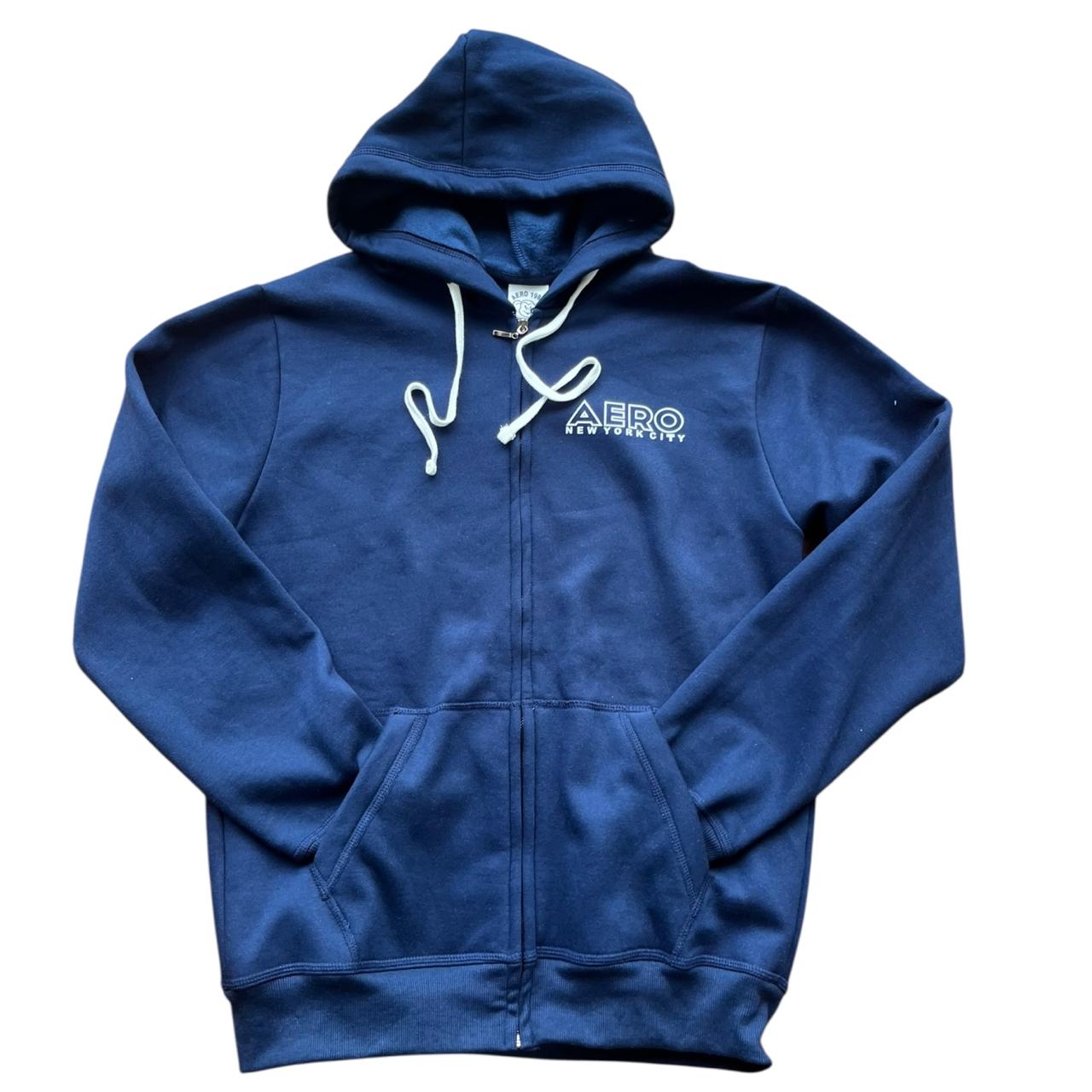Polera azul con cierre, estampada pecho y espalda, con capucha y canguro