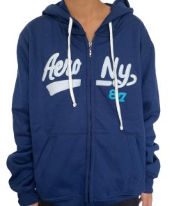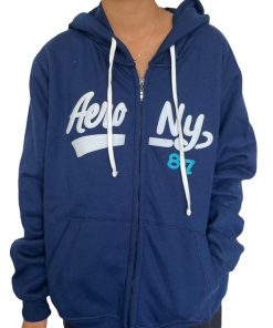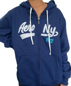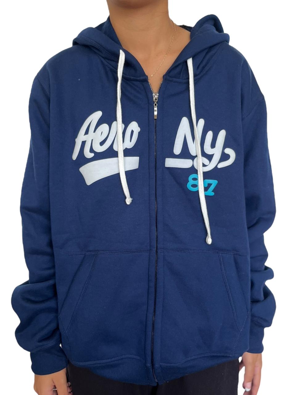 Polera con cierre, estampada en el pecho, con capucha y canguro