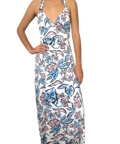 Vestido largo, amarrado en el cuello, abertura lateral.