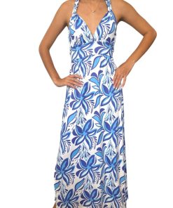 Vestido largo, amarrado en el cuello, abertura lateral.